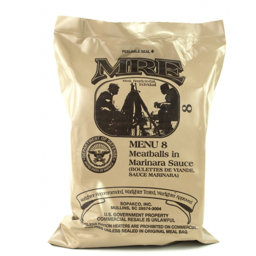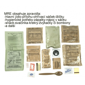 Razione alimentare da combattimento - MRE (Pasto pronto da mangiare). Razione alimentare confezionata in un sacchetto di plastica gommata in materiale impermeabile. Contiene cibo per una persona. Ogni confezione contiene cibo con un valore totale di circa 5000 kJ, che durerà per anni se conservato nella sua confezione originale nelle giuste condizioni. Contenuto tipico della confezione: Pasto principale Sacchetto riscaldante (ad eccezione dei pasti che non necessitano di essere riscaldati) Dessert (patatine, barretta di muesli, caramelle, ecc.) Snack (panino dolce, pane + marmellata, ecc.) Bevande istantanee (caffè, bevande sportive, succo in polvere, ecc.) Cucchiaino Sacchetto aggiuntivo (fiammiferi, caffè, zucchero, sale, tovagliolo, gomma da masticare) Pasti diversi hanno composizioni diverse dei singoli componenti, ma sono sempre una combinazione molto nutriente che durerà tutto il giorno. Principali vantaggi di MRE: Cibo caldo anche senza fuoco Alto valore energetico Lunga durata di conservazione Facile da trasportare Peso ridotto Secondo gli standard militari, questa è una razione alimentare di 12 ore. Contiene allergeni: 1 - 14