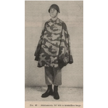 Questo telo consentiva di costruire gia di per se una tenda, infatti veniva consegnato assieme a parti di bastoni d’acciaio ed a picchetti. Con l’uso di piu teli si potevano costruire tende piu o meno larghe. La mimetizzazione era formata da chiazze rossicce sagomate ed arrotondate con spruzzi verdi e avana. Il rovescio non aveva una vera e propria mimetizzazione, ma era di tonalità rossiccia.